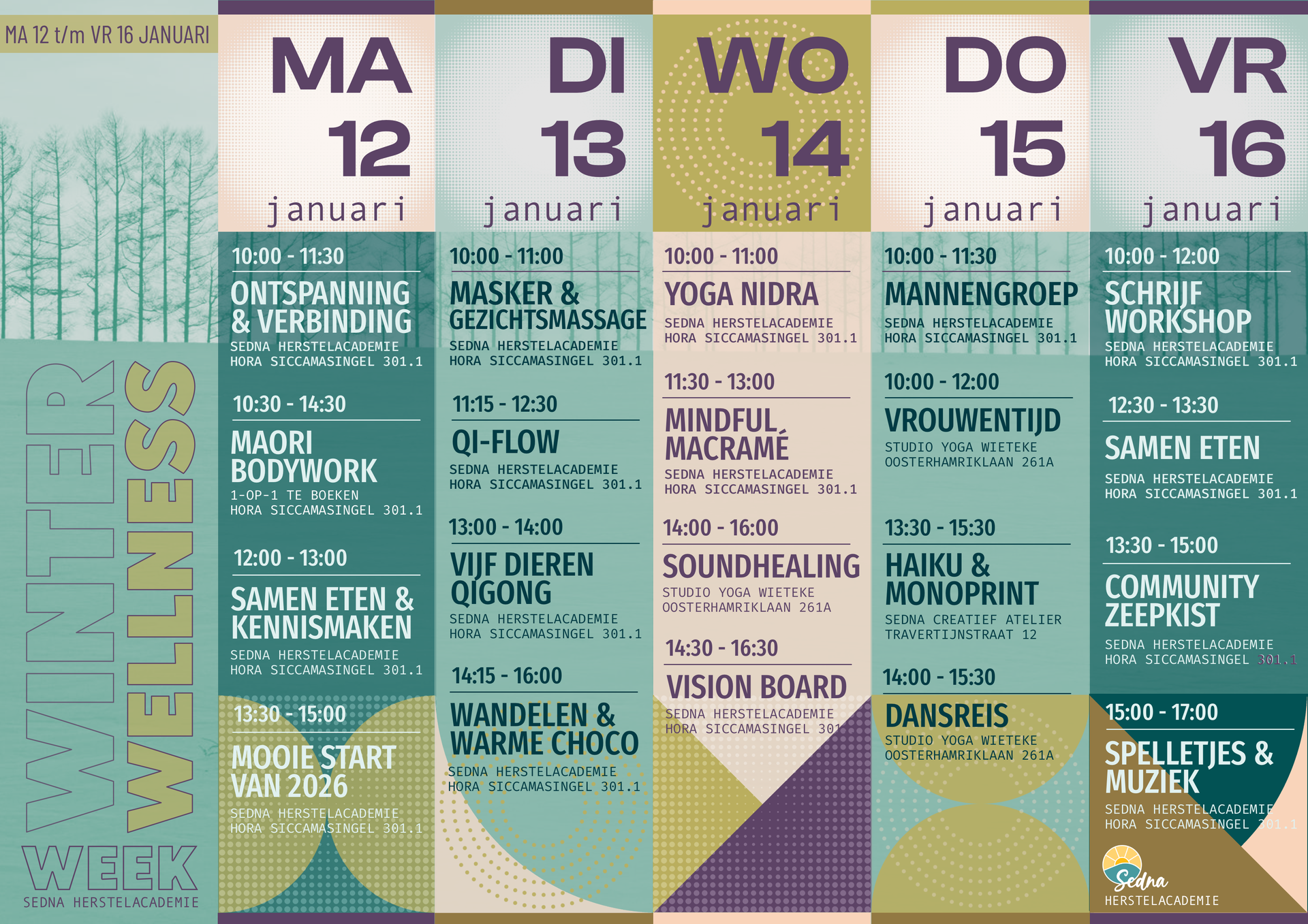 De Winter Wellness Week is een week vol losse activiteiten gericht op ontspanning, ontmoeting en een goed gevoel. Tijdens deze week kun je op een vrijblijvende manier kennismaken met Sedna Herstelacademie. Het is open voor iedereen die nieuwsgierig is naar de herstelacademie, zin heeft in heerlijke ontspannende momenten en graag anderen wil ontmoeten. Download HIER het programma van de Winter Wellness Week.